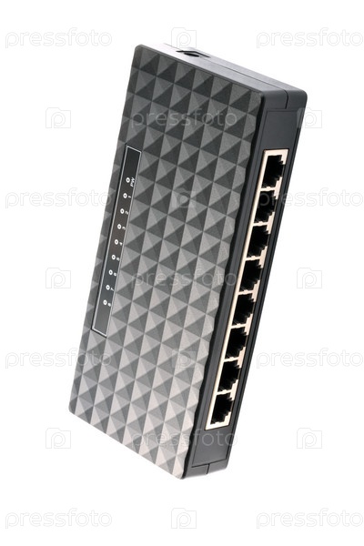 Черный 8-портовый пластиковый Ethernet-коммутатор, изолированный на белом фоне в сухой день