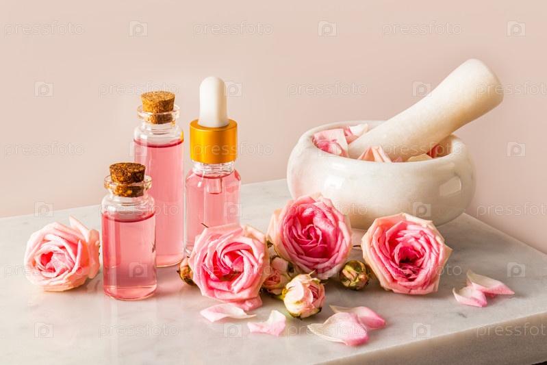 Набор натуральной косметики для ухода за кожей лица и тела на основе розового масла в различных флаконах и ступке с пестиком и лепестками роз. мраморный подиум