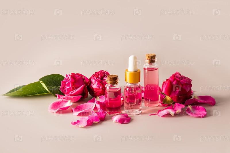 Набор косметики на основе розового масла в различных флаконах среди бутонов маленьких роз на бежевом фоне. домашний уход