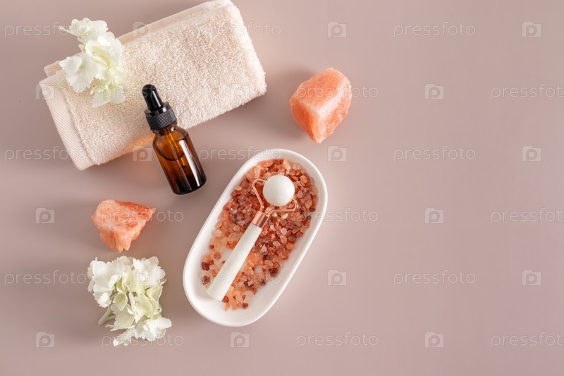 Бутылка косметического средства на валике полотенца, массажер из белого камня в овальной миске с солями для ванн. Вид сверху . Пространство для копирования