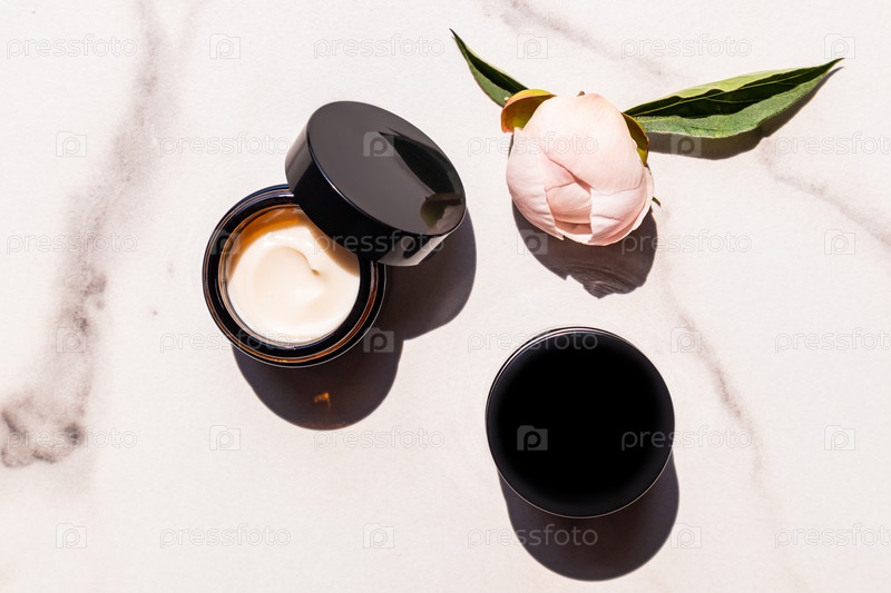 Открытая банка из темного стекла с косметическим средством по уходу за собой на мраморно-белом фоне и бутоном пиона. натуральная косметика