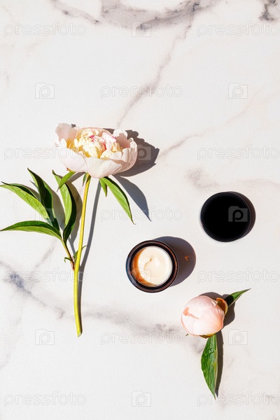 Вид сверху на открытую банку крема для ухода за молодой кожей лица на фоне белого мрамора среди свежего пиона. Понятие красоты