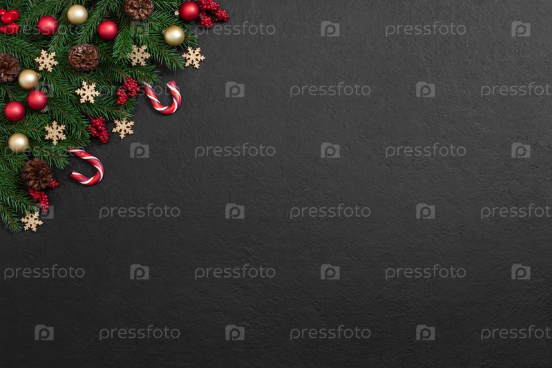 Рождественский черный фон с еловыми ветками, красными и золотыми безделушками, шишками и леденцами. Новый год. Открытка. Скопируйте пространство, вид сверху, плоская планировка