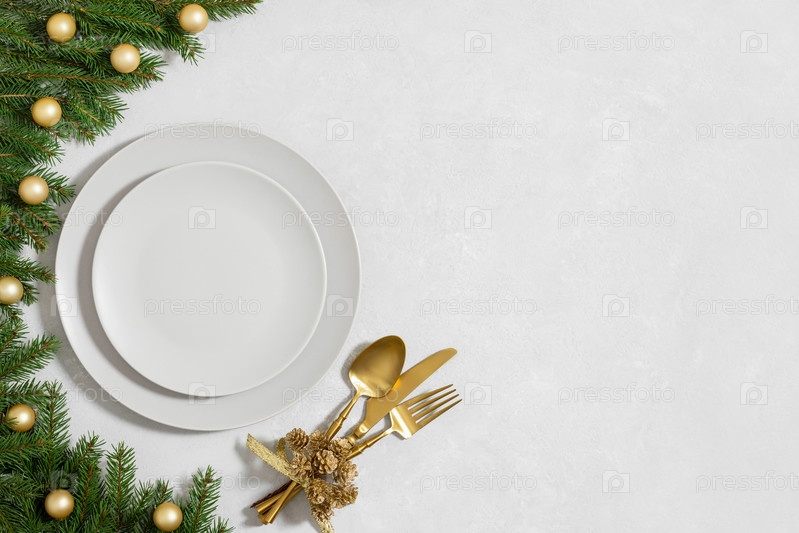 Сервировка рождественского золотого стола и на сером фоне. Пустая тарелка для дизайна. Новогодняя вечеринка. Скопируйте пространство, вид сверху, плоская планировка