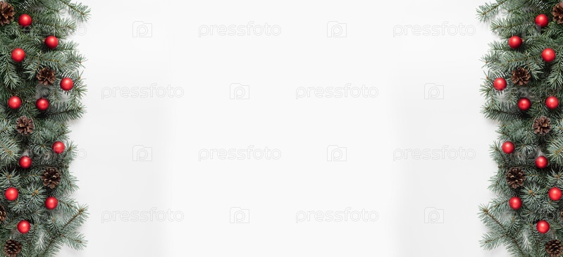Рождественский баннер с еловыми ветками, красными шарами и шишками на белом фоне