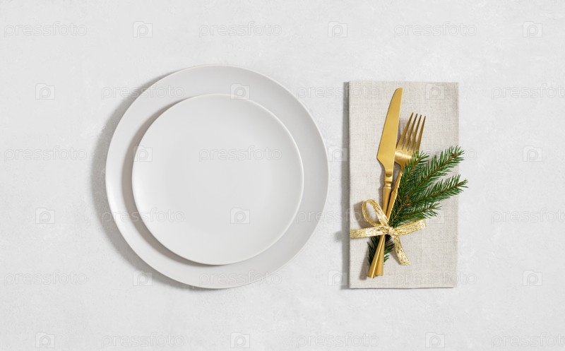 Пустая тарелка с золотыми столовыми приборами и еловой веткой на сером фоне. Рождественский ужин. Скопируйте пространство, вид сверху, плоская планировка