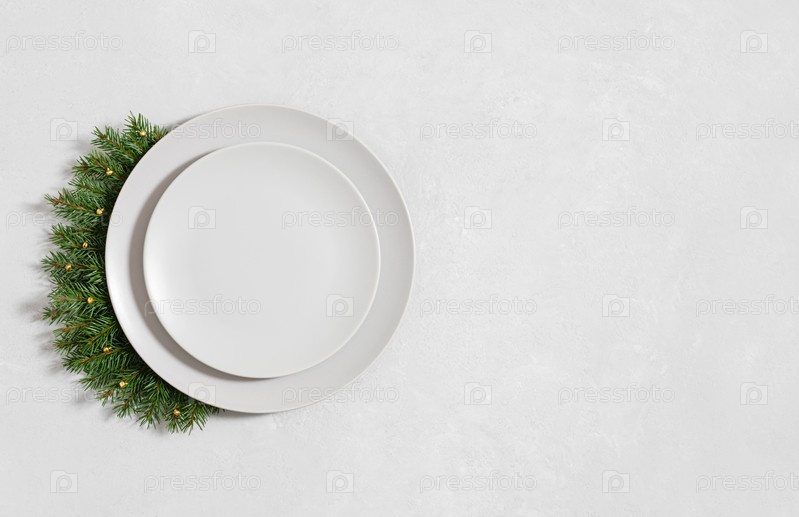 Рождественская минимальная сервировка стола с пустой тарелкой и еловыми ветками на сером фоне. Вид сверху. Место для текста