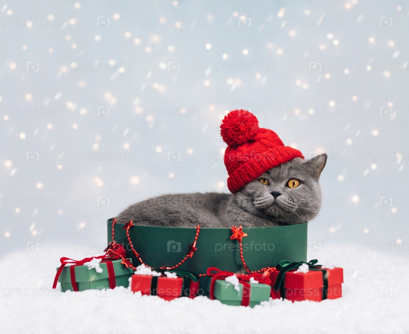 Рождественский кот в красной шапке с подарками на фоне снежной зимы. Британский кот в подарочной упаковке. Забавная рождественская открытка с копией пространства. С Новым Годом