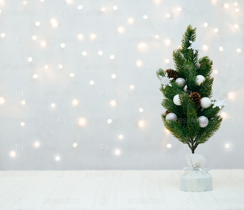 Белая пустая столешница с елкой. Изображение для монтажа или показа вашей продукции. Новогодний фон