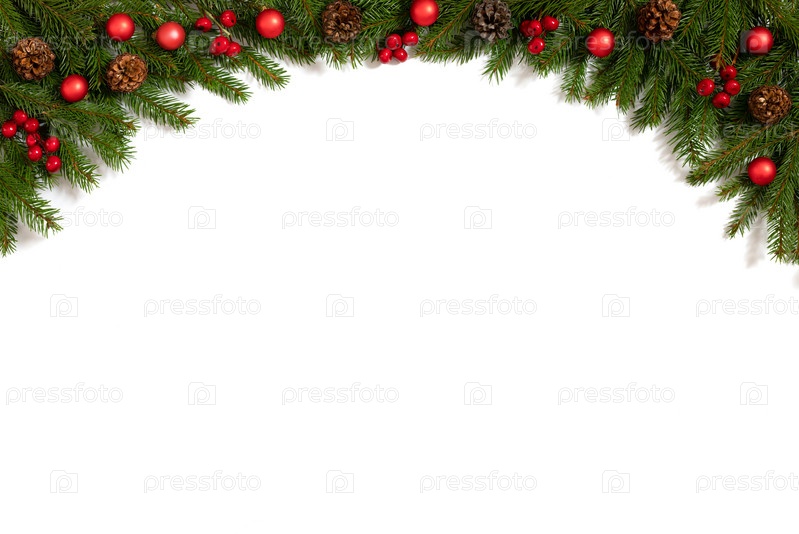 Новогодняя рамка с еловыми ветками и красными украшениями на белом фоне. Рождественская открытка. С Новым Годом. Вид сверху. Место для текста