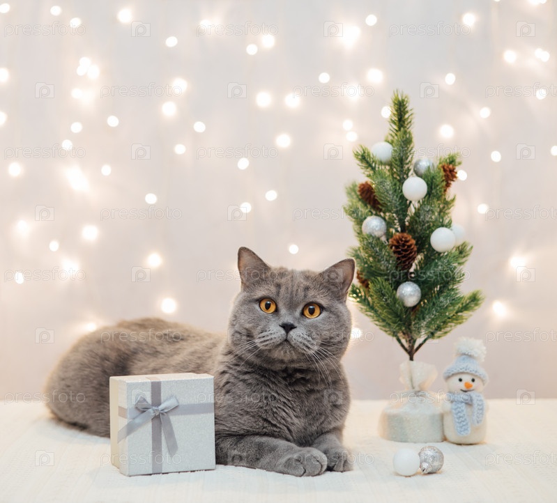 Британский кот и рождественские украшения на белом фоне с огнями боке. Милый кот лежит рядом с елкой и подарком. С Новым Годом. Скопируйте пространство