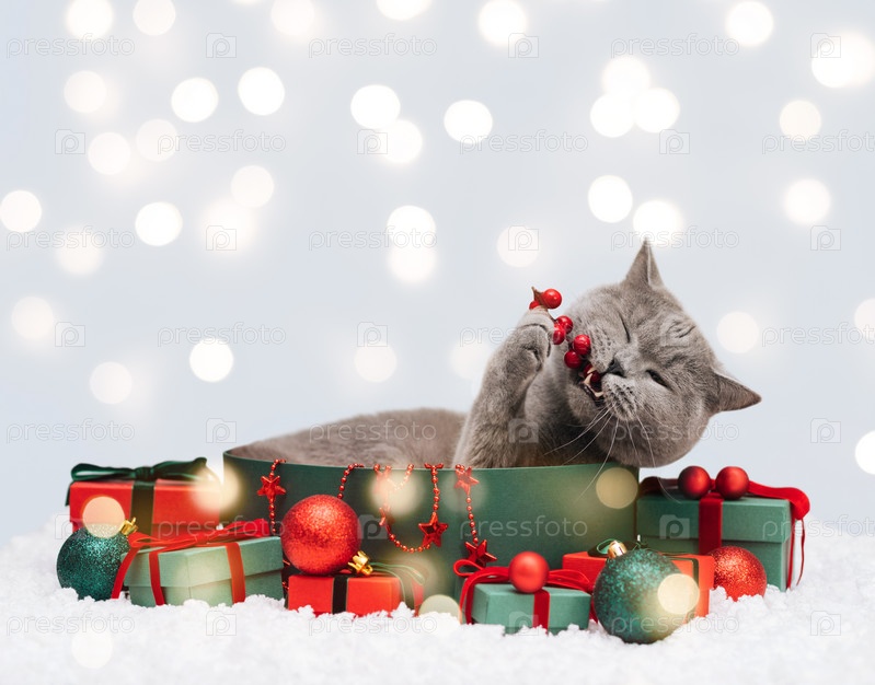 Рождественский кот в подарочной коробке кусает праздничный декор. Британский кот с подарочными коробками на фоне снежной зимы с огнями. Новогодняя открытка. Место для текста. Символ 2023 года