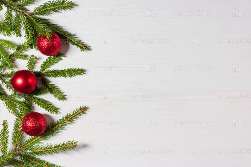 Рождественская граница из еловых веток и красных шаров. Новогодний фон на белом деревянном столе. Плоская планировка, вид сверху, пространство для копирования. Рождественская концепция