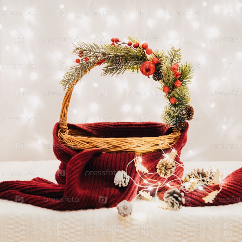 Рождественская пустая корзина с праздничными украшениями, светящейся гирляндой и шарфом на фоне огней. Шаблон рождественского дизайна. С Новым Годом