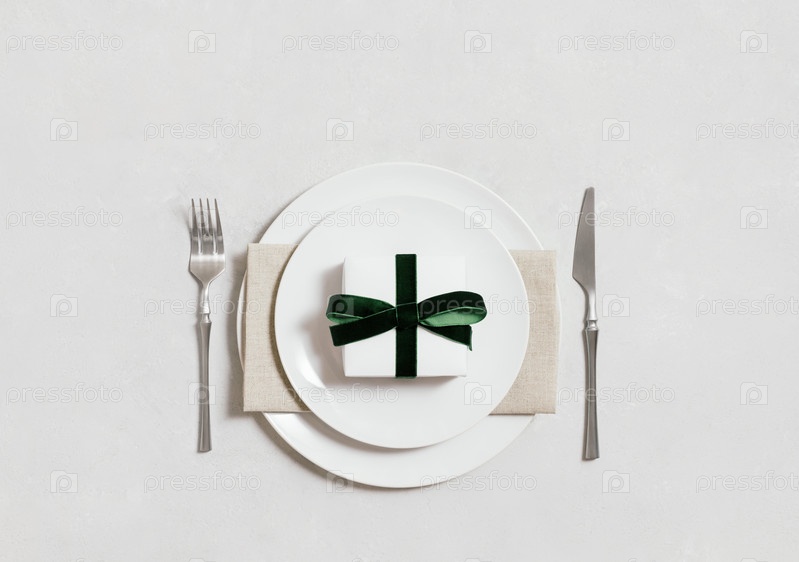 Праздничная сервировка стола с подарком зеленого лука в тарелке на сером фоне. Рождественский ужин. Скопируйте пространство, вид сверху, плоская планировка