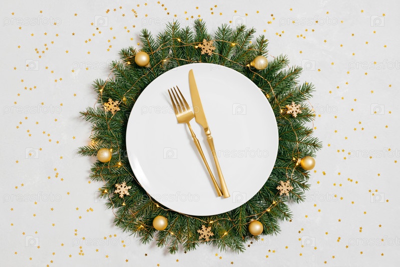Сервировка рождественского стола с новогодним венком, золотыми столовыми приборами и конфетти на сером фоне. Вид сверху, плоская планировка