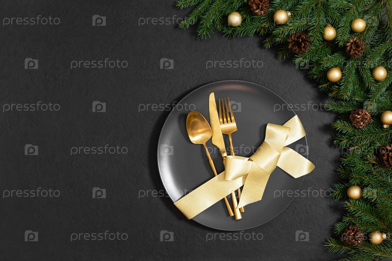 Сервировка рождественского стола с золотыми столовыми приборами и бантом в тарелке на черном фоне. С Новым Годом. Место для текста. Вид сверху, плоская планировка