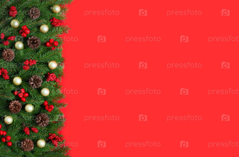 Рождественский красный фон с еловыми ветками, шишками, ягодами и золотыми безделушками. Рождественская граница. Праздничная открытка с местом для текста. Вид сверху, плоская планировка