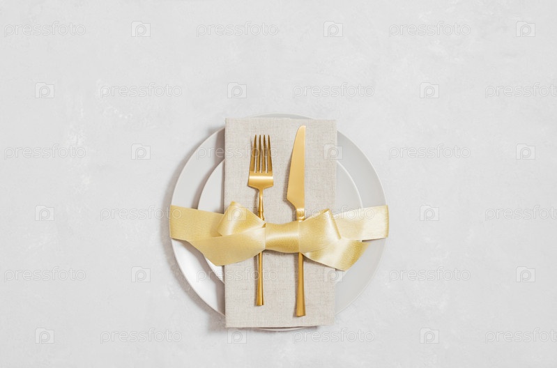 Праздничная сервировка стола с золотыми столовыми приборами и бантом в тарелке на сером фоне. Рождественский ужин. Скопируйте пространство, вид сверху, плоская планировка