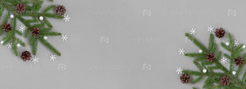 Рождественский баннер с еловыми ветками, шишками и серебряными снежинками. С Новым Годом. Зимняя концепция. Место для текста