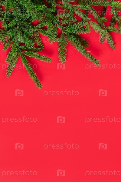 Рождественская граница с еловыми ветками на красном фоне. С Новым Годом. Место для текста