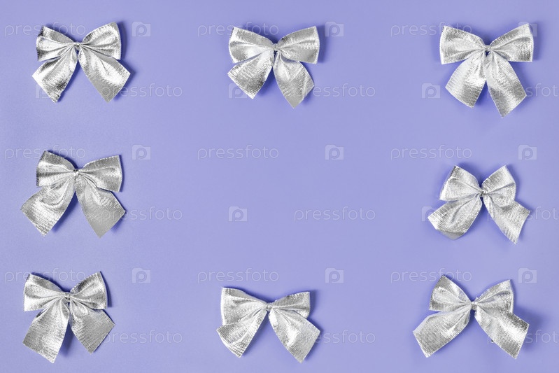 Рождественская граница с серебряными бантами на пастельно-фиолетовом фоне. Модный цвет очень пери в 2022 году. Место для текста