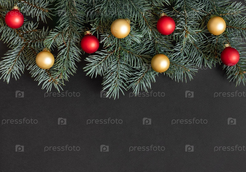 Рождественская граница с еловыми ветками, красными и золотыми шарами на черном фоне