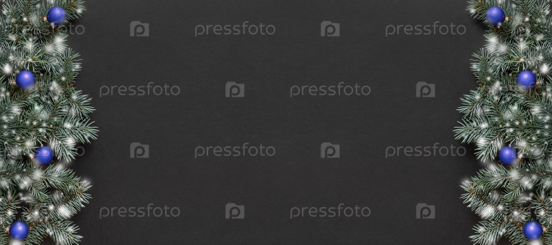 Рождественский баннер с еловыми ветками, синими шарами и снегом на черном фоне. Вид сверху. Место для текста