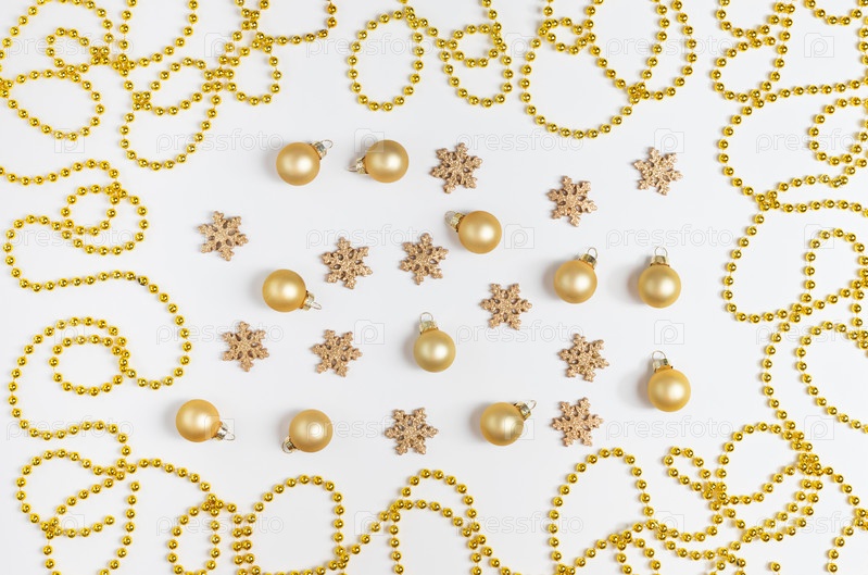 Рождественский узор с золотыми шарами, снежинками и гирляндой на белом фоне