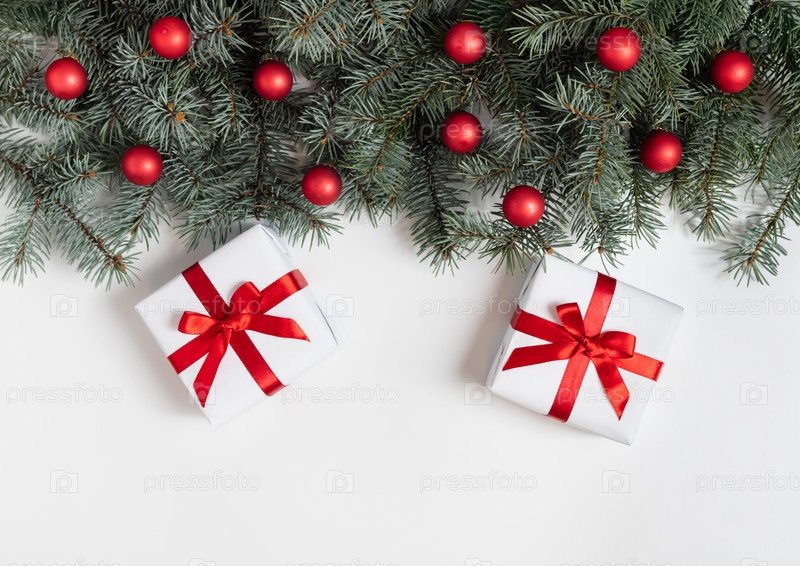 Рождественская граница с еловыми ветками, красными шарами и подарками на белом фоне