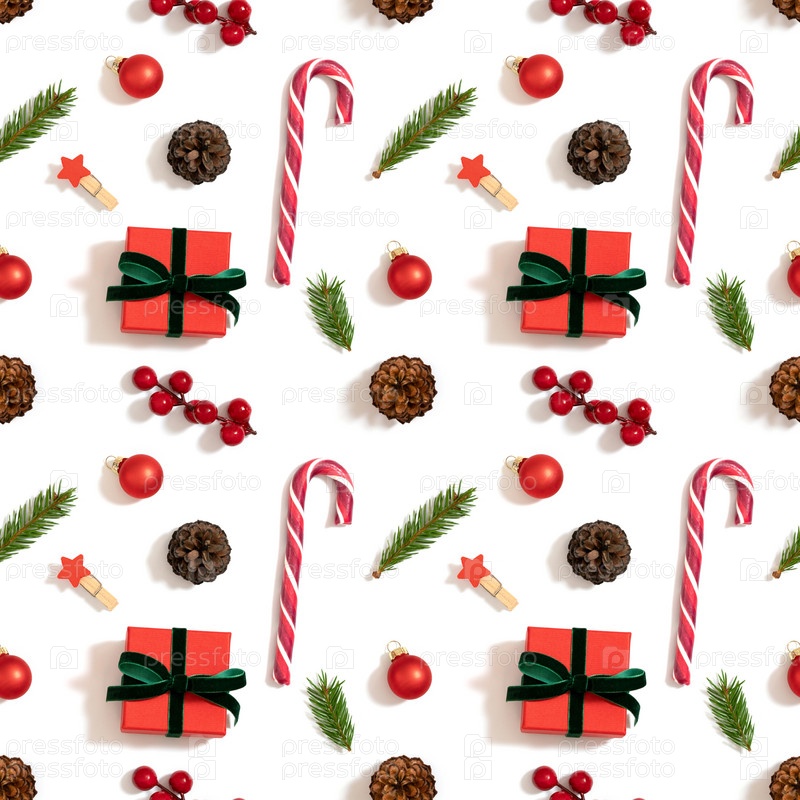 Рождественские украшения бесшовные модели на белом фоне. Подарки, еловые ветки, ягоды и леденцы. Зимняя концепция. Вид сверху, плоская планировка. С Новым Годом