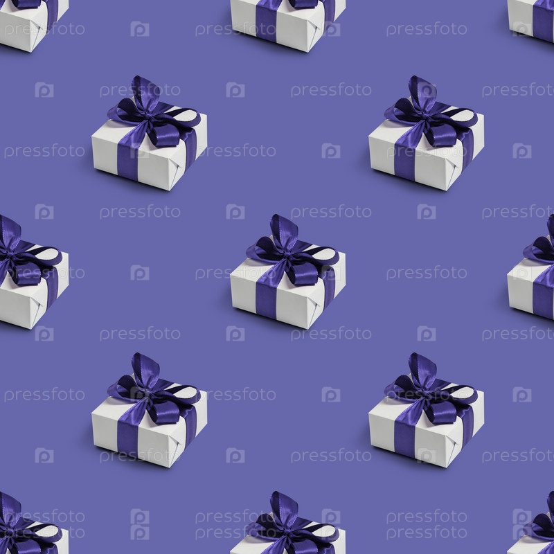 Бесшовный узор с милыми подарками на фиолетовом фоне. Цвет 2022 года Очень Пери