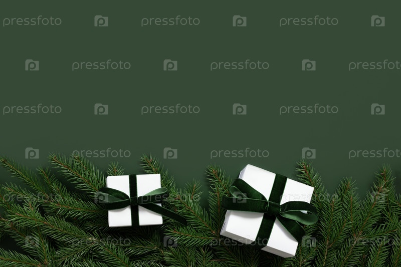Рождественский зеленый фон с еловыми ветками и подарочными коробками. Рождественская граница. Праздничная открытка с местом для текста. Вид сверху