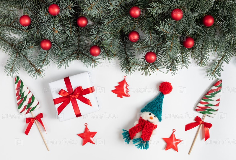 Рождественская композиция со снеговиком, леденцами, еловыми ветками и елочными украшениями