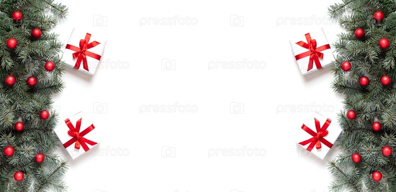 Рождественский баннер с еловыми ветками, красными шарами и подарками на белом фоне