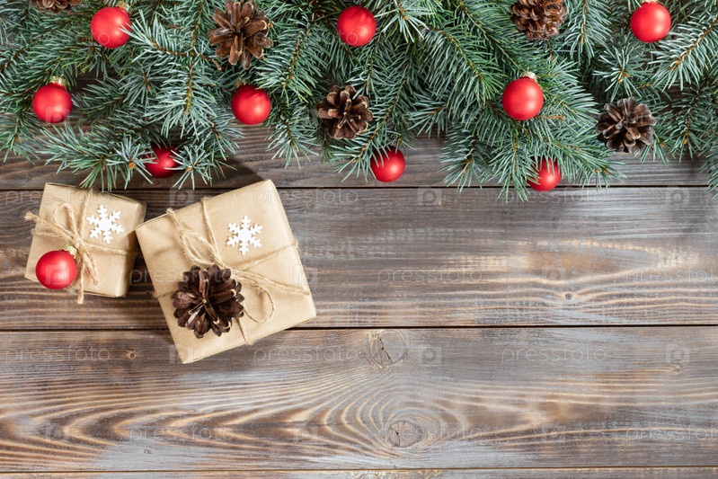 Рождественская граница с еловыми ветками, красными шарами, шишками на деревянном фоне