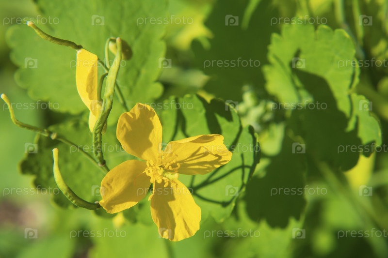 Желтый цветок чистотела крупным планом на фоне зелени. Милый желтый цветок лекарственной травы Чистотел со стручками семян, крупным планом