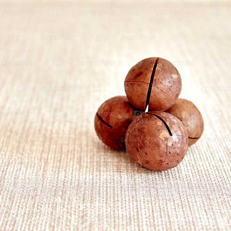 Четыре ореха макадамии сложены в форме пирамиды