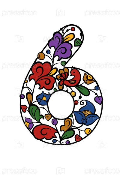 Нарисованная иллюстрация номер шесть в цветочном орнаменте на белом фоне
