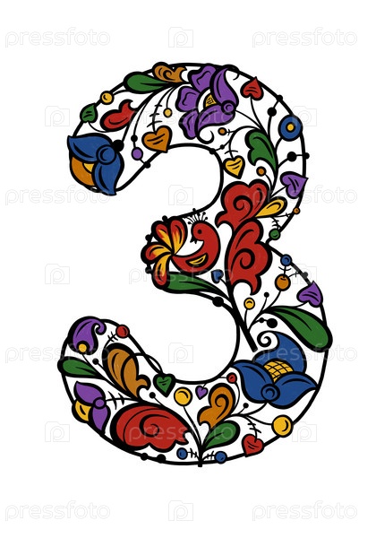 Нарисованная иллюстрация номер три в цветочном орнаменте на белом фоне