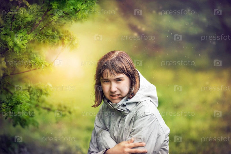 Девушка прячется от дождя под деревом. Летний дождь