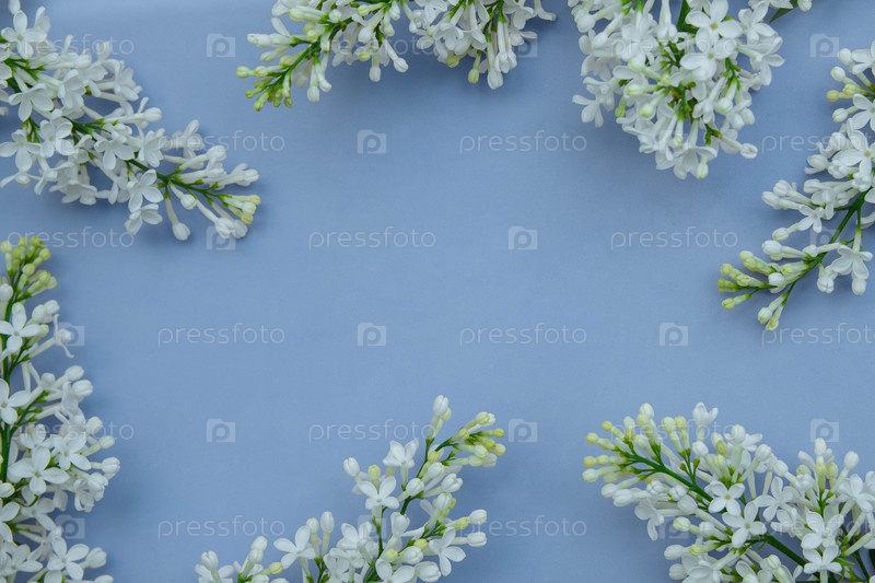 Рамка из белых сиреневых цветов крупным планом на синем фоне с пустым пространством для текста, концепции приветствия, визитных карточек и фона
