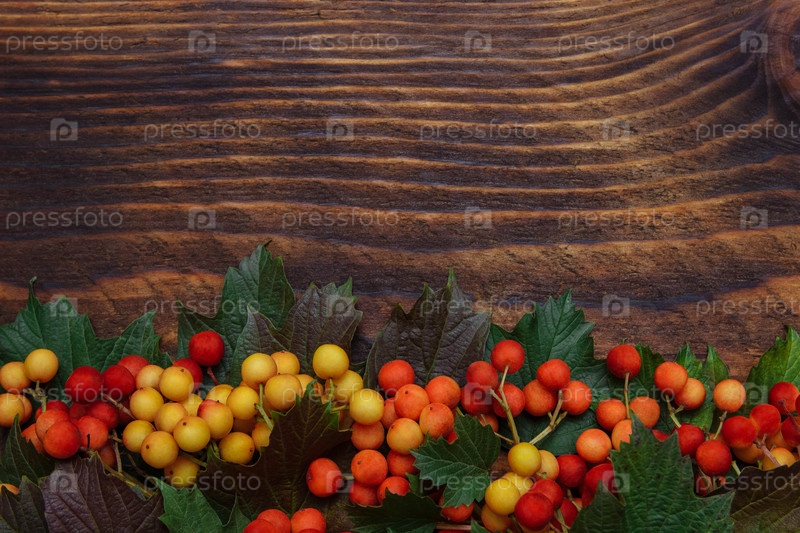 Красные и желто-оранжевые ягоды калины с листьями на коричневом деревянном фоне с пустым пространством для текста, пространство для копирования, плоская планировка, концепция осеннего урожая, реклама продукта, бабье лето, дизайн обложки