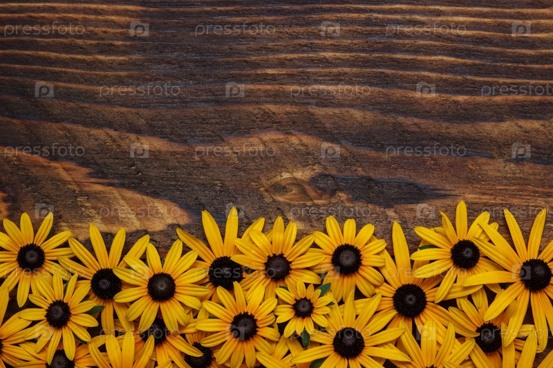 Рамка из желтых цветов подсолнуха, ромашки или эхинацеи на коричневом деревянном фоне с пустым пространством для текста, пространство для копирования, плоская планировка, концепция фона для дизайна обложки, реклама органических продуктов