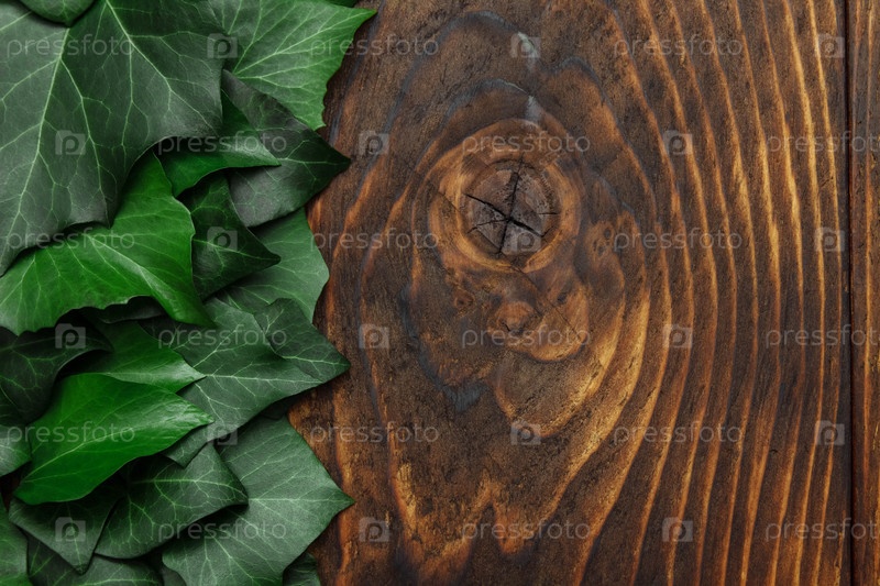 Зеленые листья плюща на винтажном коричневом фоне крупным планом с пустым пространством для текста, пространство для копирования, плоская планировка, концепция дизайна обложки, поздравительная открытка, фон для органических продуктов, элемент декора