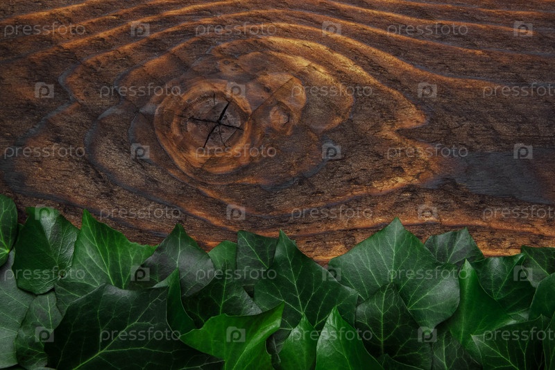 Зеленые листья плюща на фоне винтажного коричневого дерева с эффектом шума и пленки, вид сверху с пустым пространством для текста, концепция органических продуктов питания, шаблон оформления обложки и этикетки, поздравительная открытка