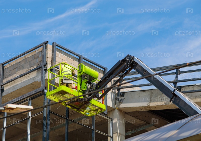 Мужчина - строитель работает на площадке крана на высоте. Строительство станции