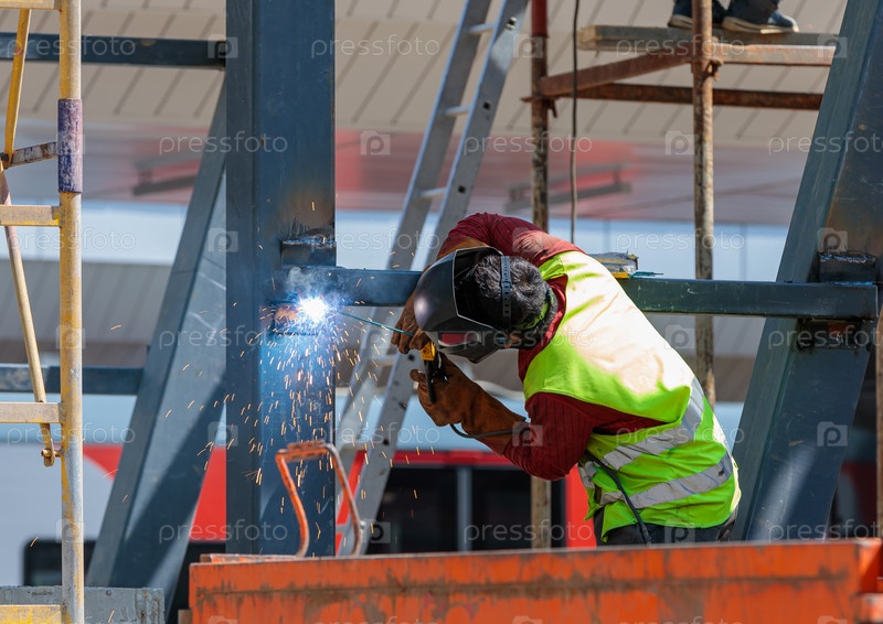 Сварщик скрепляет железные балки сварочным аппаратом. Строительство станции