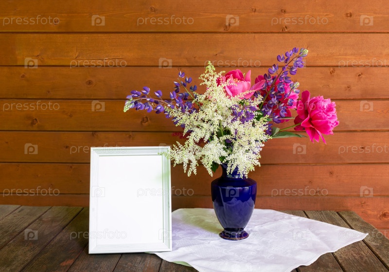 Пустая белая рамка и красивый букет из астильбы, люпина и пионов в синей вазе на деревенском деревянном столе