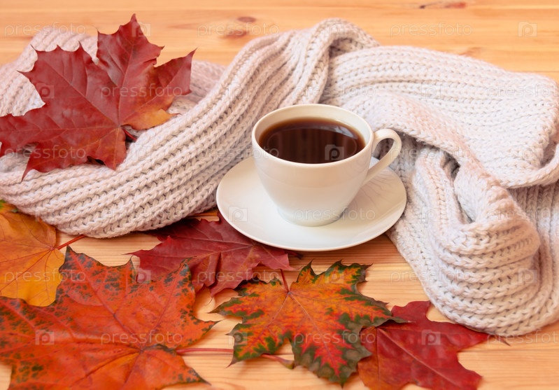 Чашка горячего кофе, шарф и красочные осенние кленовые листья на деревянном столе. Селективный фокус на чашке
